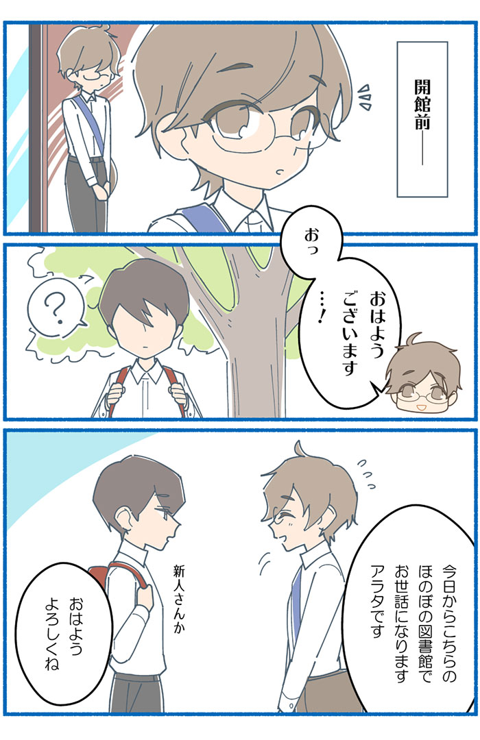 今日から、お兄さんの勤める『ほのぼの図書館』に新しい仲間が加わります。新卒ぴちぴちの男の子です。